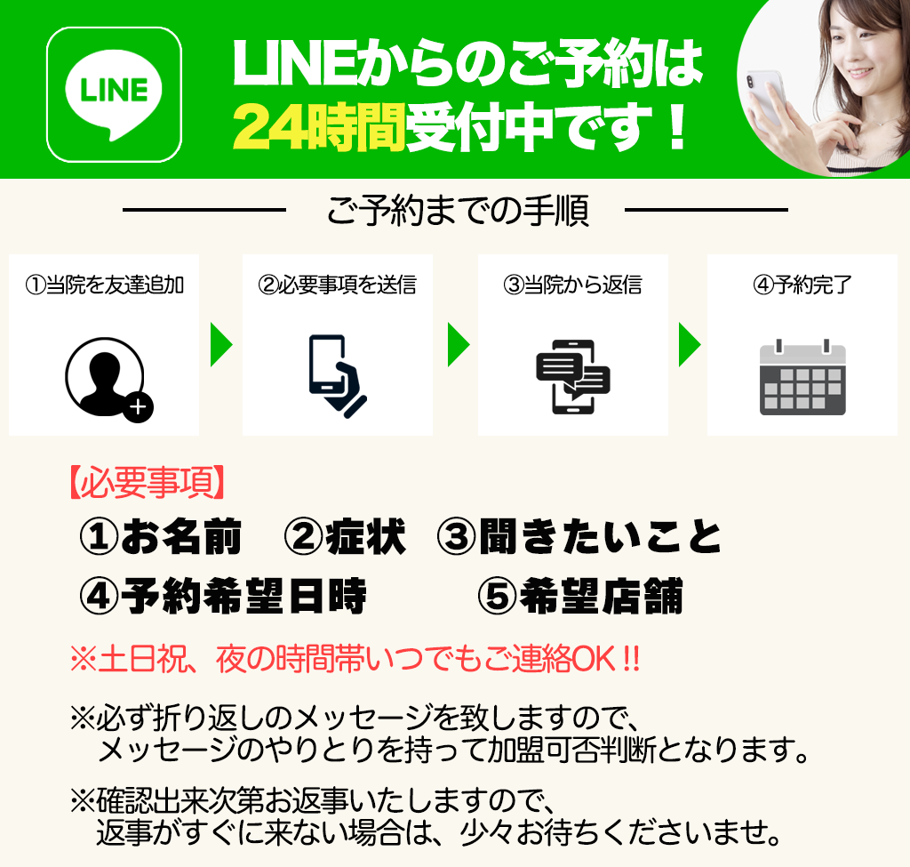 完全予約になっておりますので、病院のような待ち時間がなく、後のスケジュールにも響かないのでご安心ください。まずは、お電話でご予約ください。